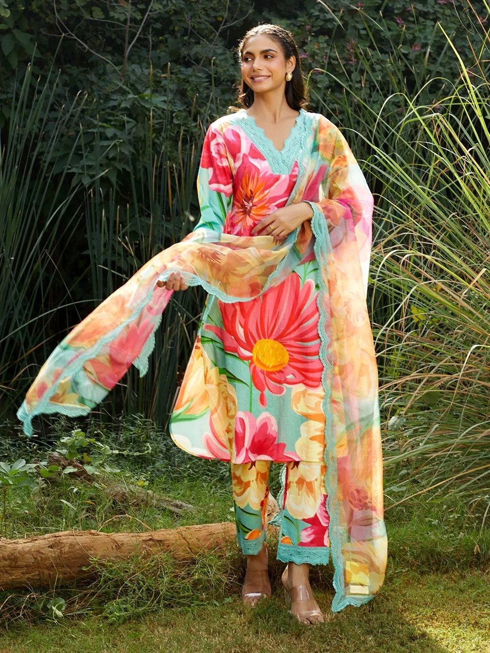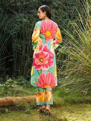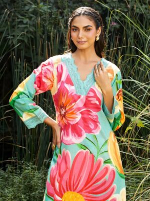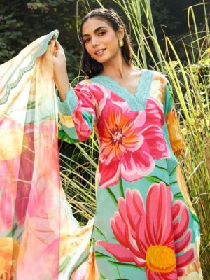 Elevate your ethnic wardrobe with this elegant women’s floral printed suit set, featuring a beautiful aqua-green base adorned with vibrant pink and yellow floral patterns. The kurti comes with a stylish V-neck design and delicate lace detailing, paired with comfortable matching printed pants for a coordinated look. The set is completed with a lightweight organza/chiffon dupatta featuring a graceful lace border, adding a soft and festive touch.