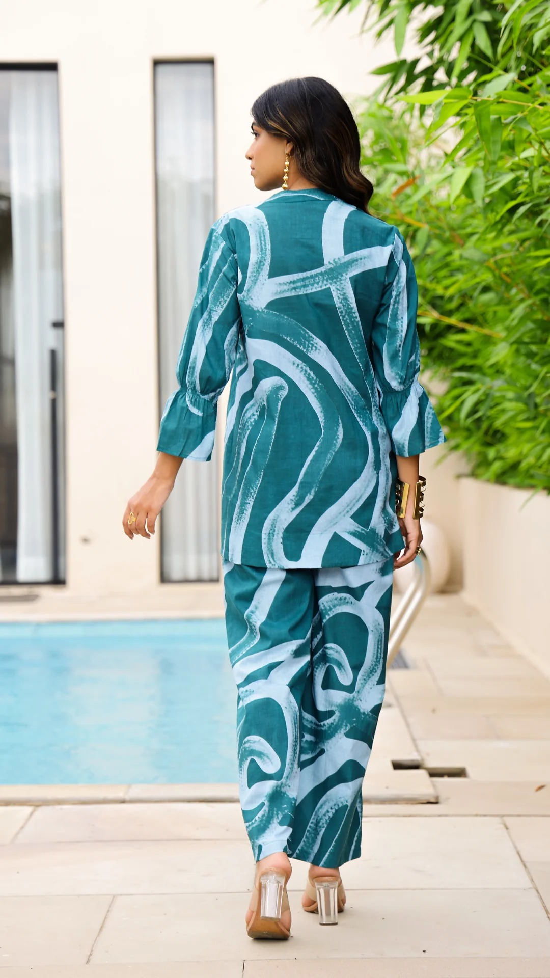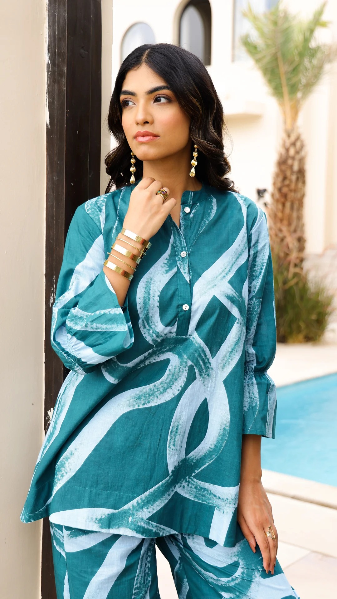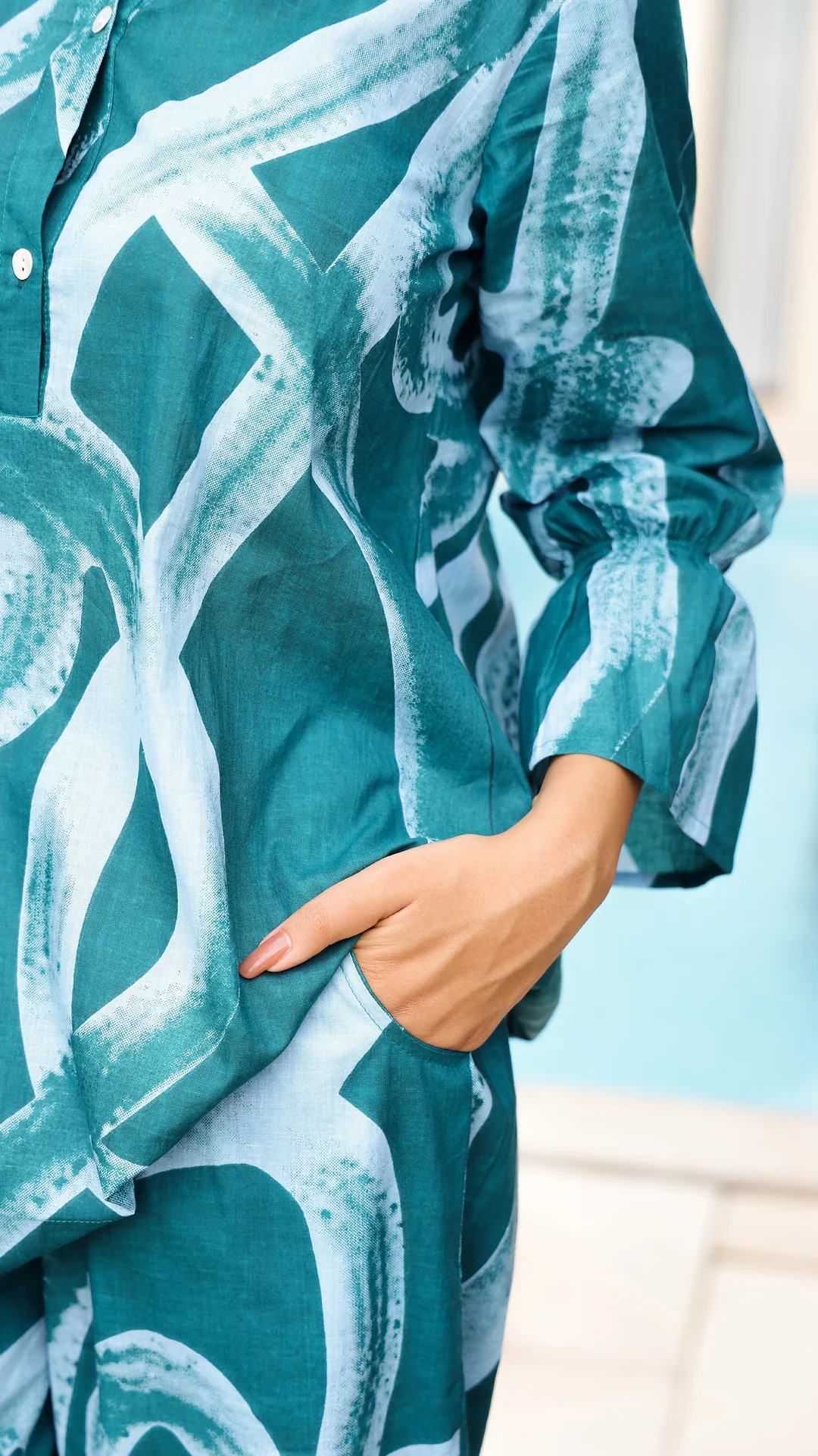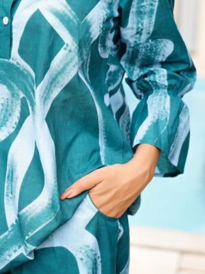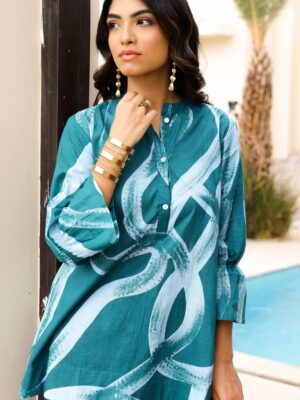 Elevate your everyday style with this stunning Teal Abstract Print Cotton Co-Ord Set, designed for effortless elegance and all-day comfort. Featuring a contemporary abstract brush-print pattern, the set includes a stylish long top with a buttoned neckline and relaxed-fit wide-leg pants. Crafted from premium breathable cotton, it offers a soft, airy feel—perfect for casual outings, brunch dates, travel, or summer wear. The modern silhouette and vibrant teal tones add a chic, trendy touch to your wardrobe.