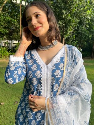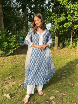 Elevate your ethnic wardrobe with this elegant Blue & White Cotton Printed Suit Set. Crafted from soft and breathable cotton, this outfit ensures all-day comfort while keeping your style effortlessly chic. The kurta features beautiful traditional floral block prints, paired perfectly with a white printed pant for a refined look. The lightweight printed dupatta adds a graceful finishing touch, making it ideal for festive occasions, casual outings, and daily wear.
