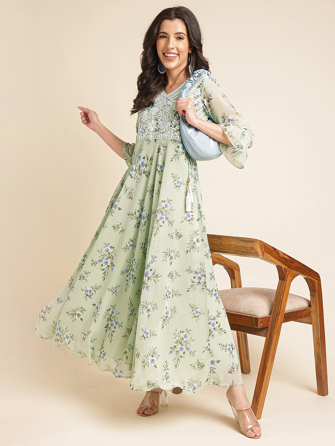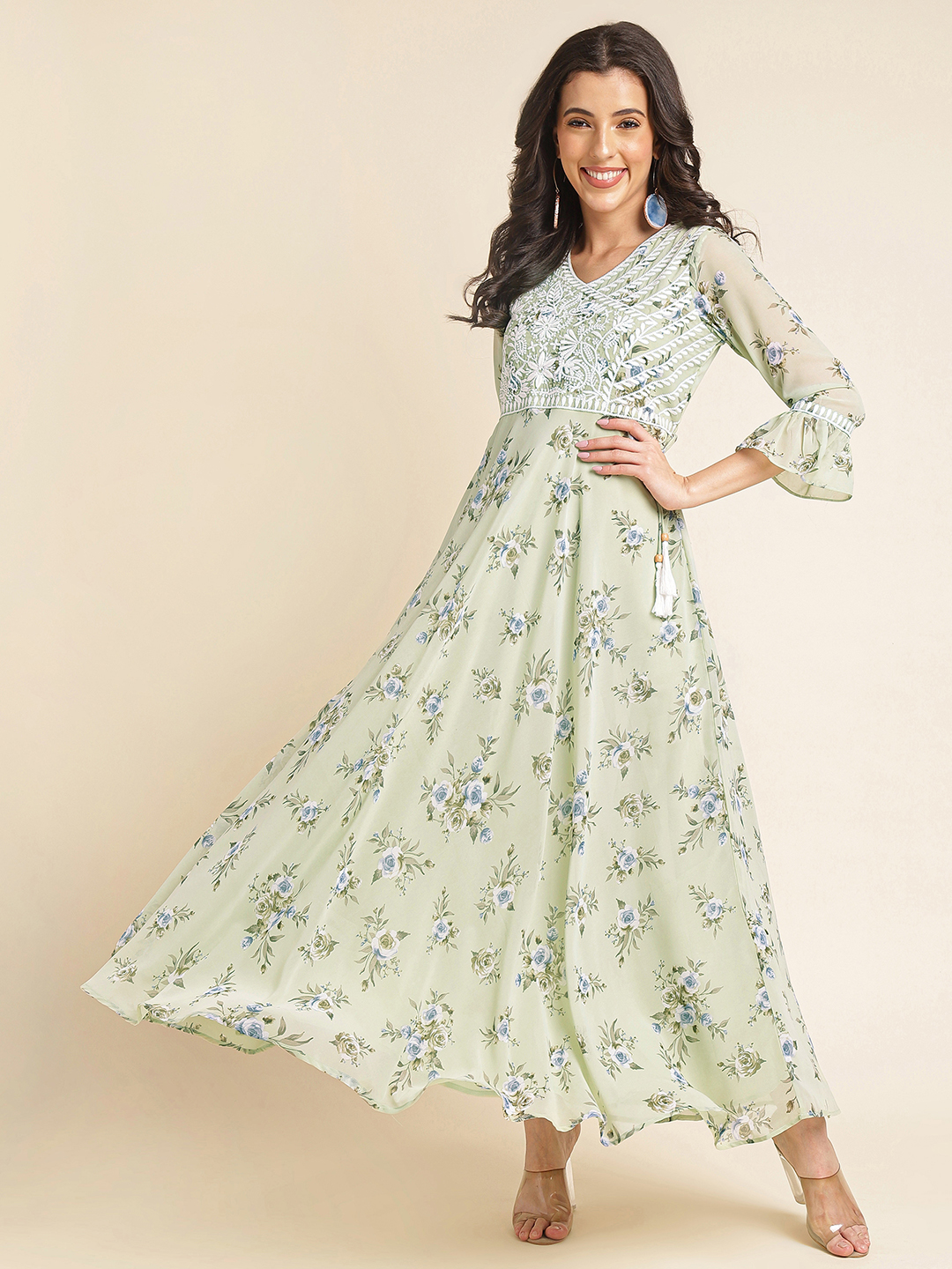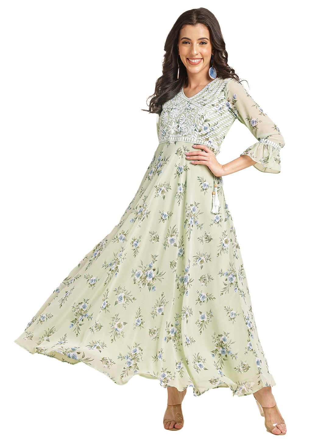 Elegant Floral Printed Anarkali Gown for Women – Light Green, Embroidered Yoke, 3/4th Sleeves