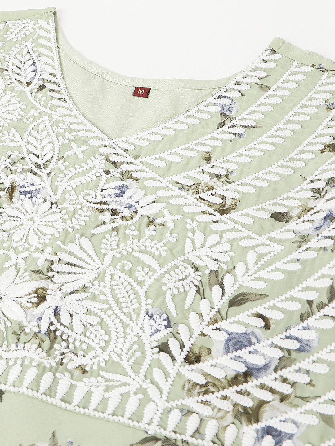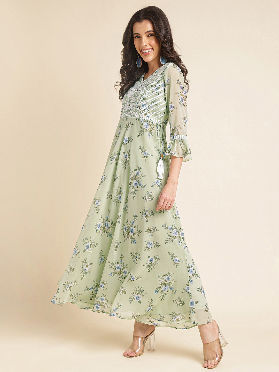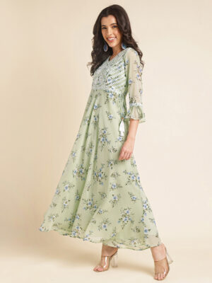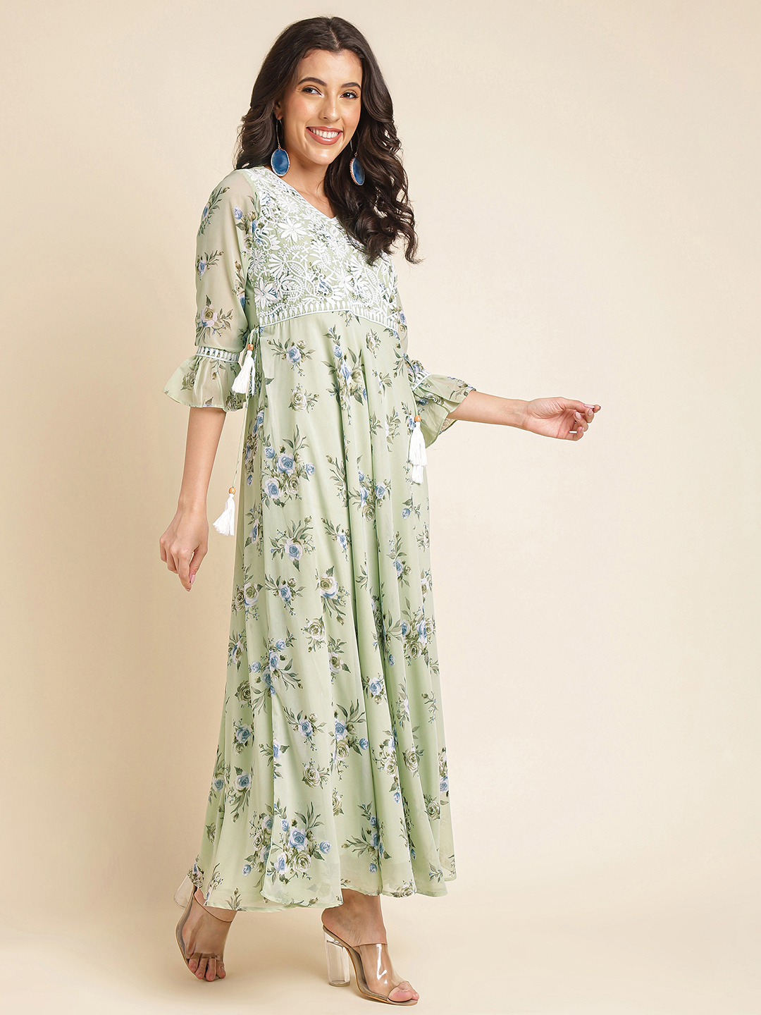 Elegant Floral Printed Anarkali Gown for Women – Light Green, Embroidered Yoke, 3/4th Sleeves