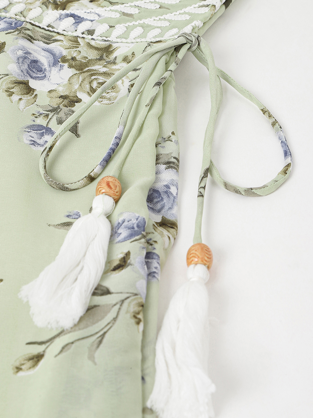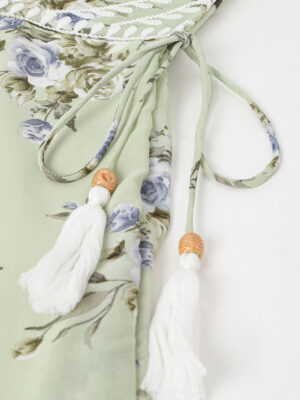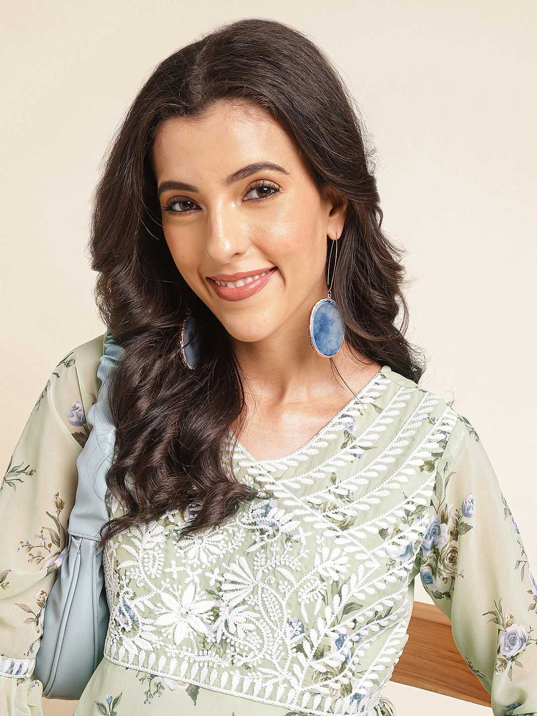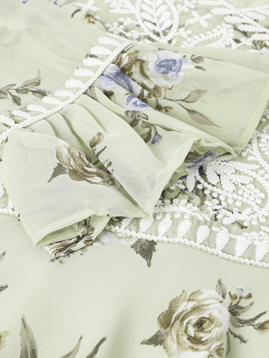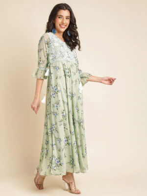This stylish light green floral Anarkali gown is designed with a beautifully embroidered yoke that adds a touch of elegance to your look. Made from soft and flowy fabric, it features an all-over pastel floral print, giving it a refreshing and graceful appeal. The gown includes 3/4th sheer sleeves with ruffle detail, a flared hem, and a comfortable fit, perfect for festive occasions, parties, casual outings, and celebrations.