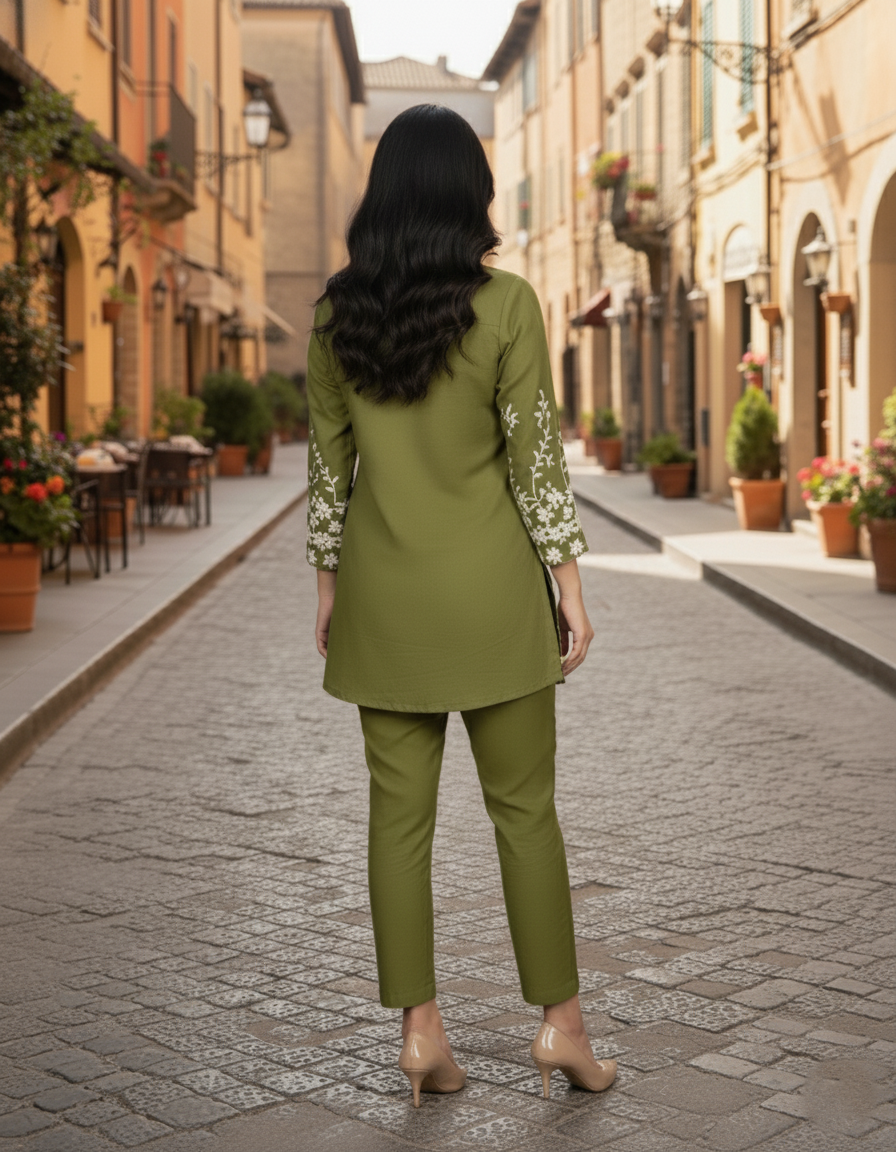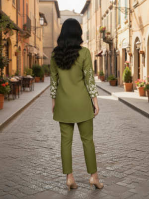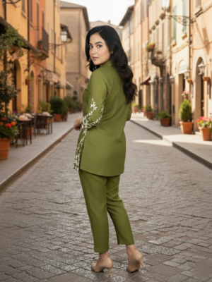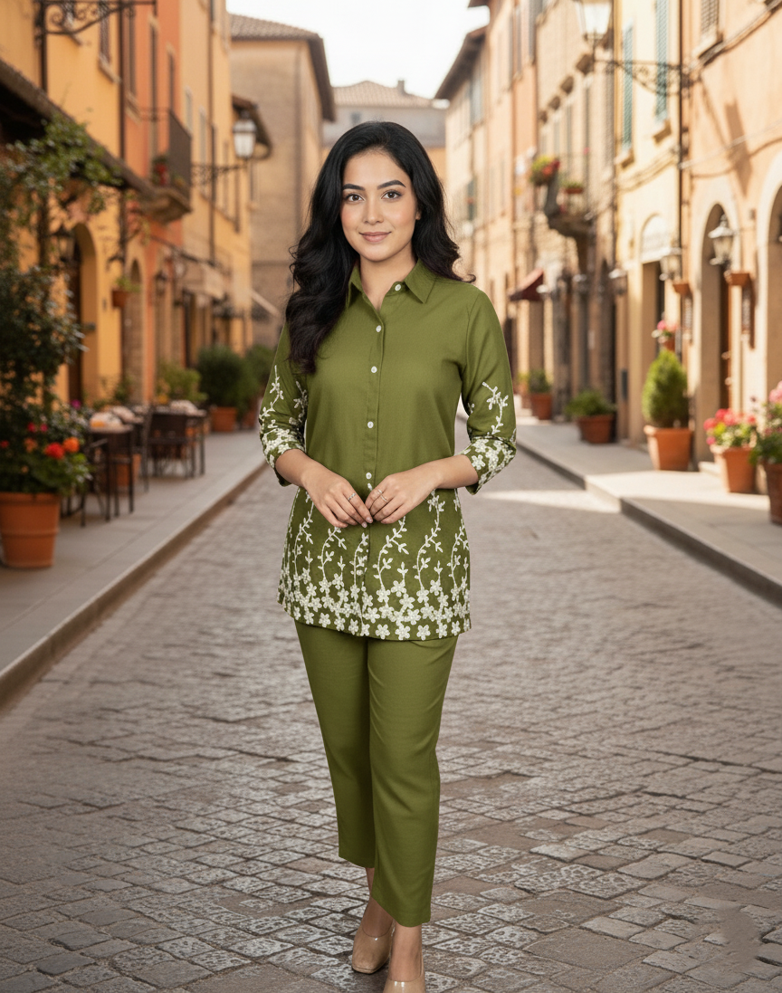 Step into effortless elegance with this stylish olive green embroidered co-ord set, perfect for both casual and office wear. The shirt-style top features a smart collar, front button detailing, and beautiful white floral embroidery along the sleeves and hem, adding a touch of sophistication to your look. Paired with matching straight-fit pants, this set offers a modern and comfortable silhouette.