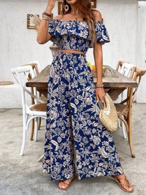 Elevate your summer style with this stunning Navy Blue Floral Off-Shoulder Co-Ord Set. Designed with a chic smocked off-shoulder crop top and paired with wide-leg palazzo pants, this outfit blends comfort with effortless elegance. The soft, breathable fabric and all-over beige floral print create a perfect look for vacations, brunch outings, beach days, and casual gatherings. The ruffled neckline and stretchable smocking give a flattering fit, while the flowy pants ensure all-day comfort and style.