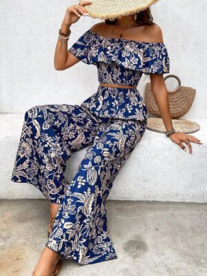 Navy Blue Floral Off-Shoulder Smocked Co-Ord Set